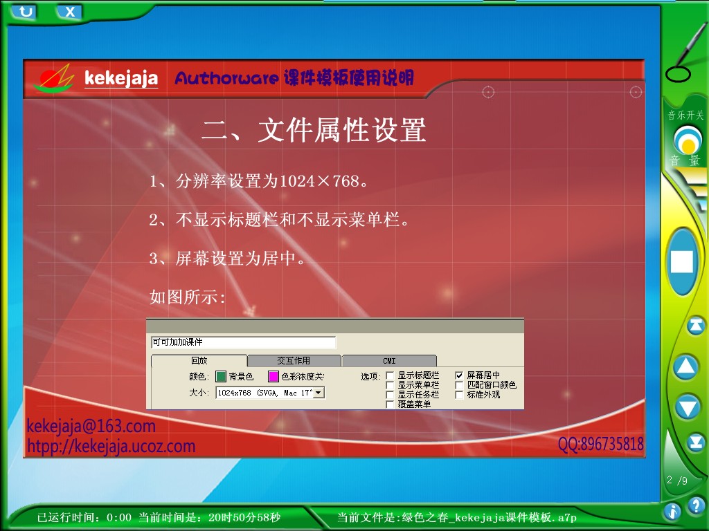 kekejaja_Authorware课件模板是运用Authorware7.0编写的一个课件翻页模板,集成了翻页的常用功能,如上一页、下一页、首页、尾页等。同时集成了常用的功能按钮,如退出、返回等,同时设置背景音乐模块,可以自由设置课件中的背景音乐。并在课件模块中植入了电子注释笔功能模块,使在多媒体演示中能够自由灵活的对关键字词进行标注、圈点等。课件界面如下: